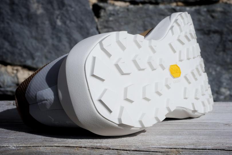 Enfin, la semelle externe s’avère excellente. L’adhérence est, sans surprise, de tout premier ordre grâce à la gomme Vibram, qui semble ici un peu plus molle que sur d’autres modèles (on pense à la Nnormal Kjerag, qui “claque” pas mal sur les parties goudronnées ou très sèches), mais cela peut aussi être dû à la hauteur des crampons de 4 mm. À voir dans le temps. Leur espacement relatif permet un peu d’évacuation dans les conditions légèrement humides, mais on retient surtout leur forme, qui permet une bonne accroche multidirectionnelle, très sécurisante dans les dévers.